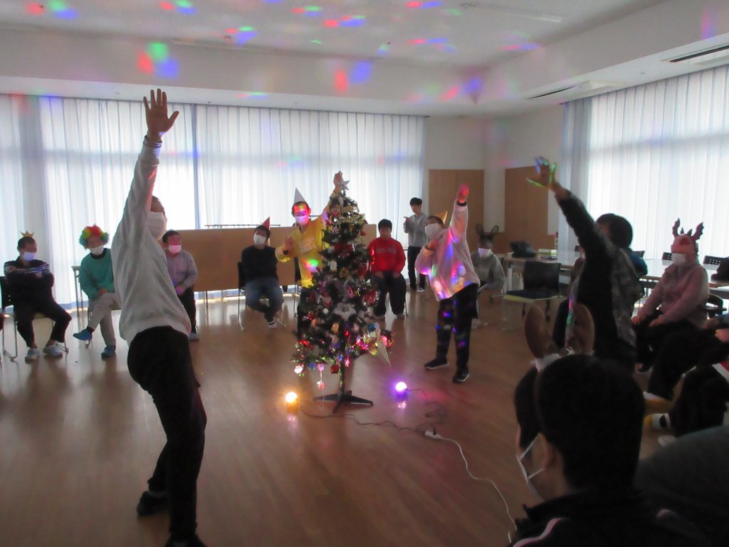 部屋を暗くしてクリスマスツリーの明かりを灯すと、雰囲気が一気に華やぎ、皆さんで踊ったり歌を歌ったりして楽しみました。