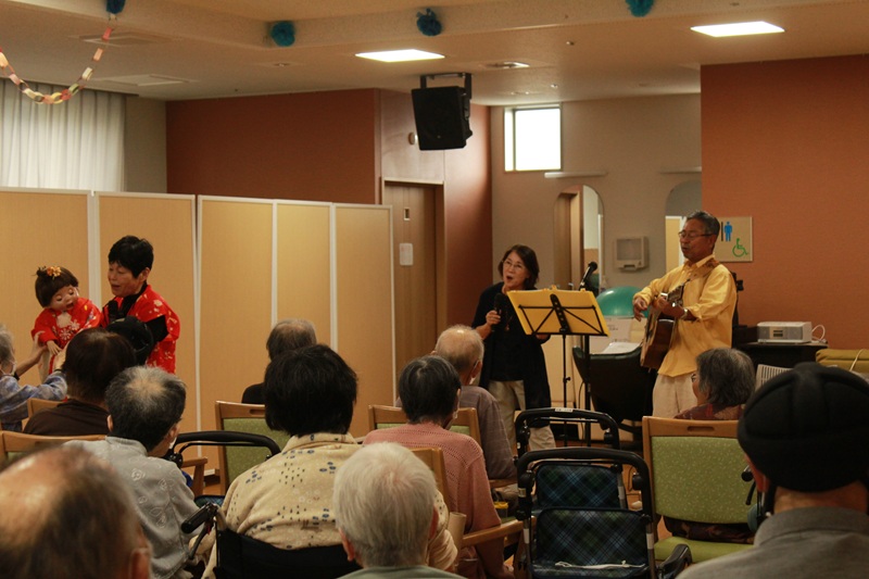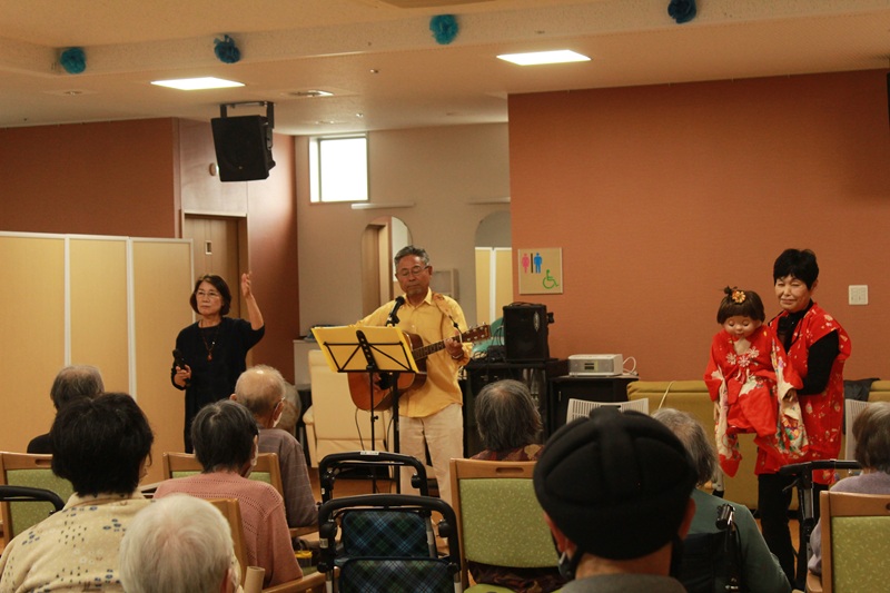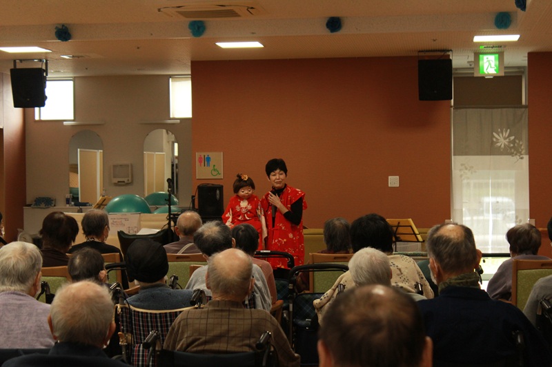 中盤には人形の「あいちゃん」が主役に。腹話術師の方との軽妙なやりとりが繰り広げられ、入居者の皆様笑顔でそのやり取りの様子を楽しまれていました。