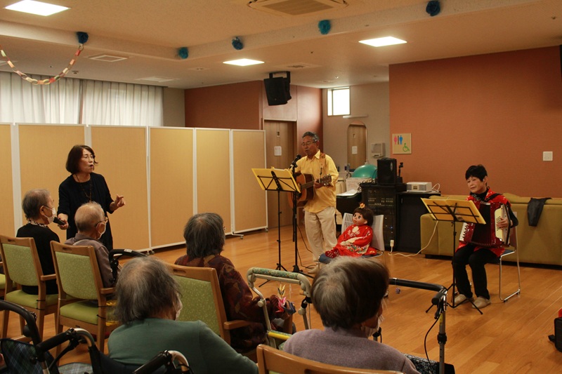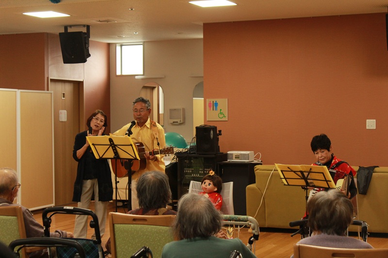 ふくれみかん様は8月に開催された上の原学園の納涼祭でギターの演奏と歌による公演を行っていただいたのですが、その際に特別養護老人ホーム上の原でも演奏を披露していただき、今回改めて皆様に演奏と歌をお楽しみいただける機会を設けさせていただきました。