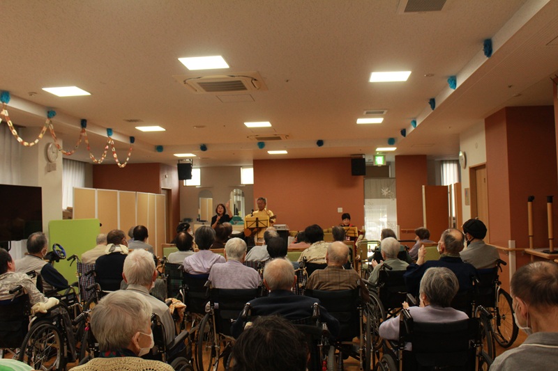 納涼祭でもギターによる演奏を披露していただきましたが、今回も歌謡曲や童謡を中心にMCを挟みながら様々な楽曲を次々と演奏され、入居者様に馴染みのある楽曲を中心に選曲いただいたこともあり皆様も思い思いに口ずさんだり、リズムをとったりと聞き入っていらっしゃる様子がみられました。