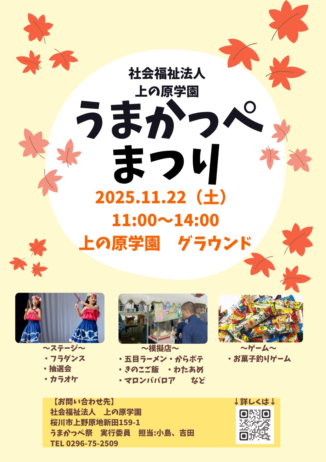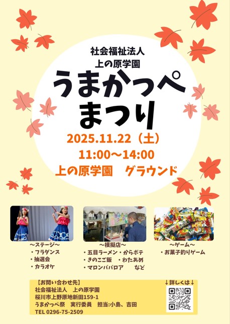 上の原学園にご縁のある方はもちろん、上の原学園の活動やサービス内容にご興味のある方、地域の皆様、当日はどなたでもご参加いただけますので、秋のお祭り「うまかっぺ祭」に皆様ぜひ遊びにお越しください♪