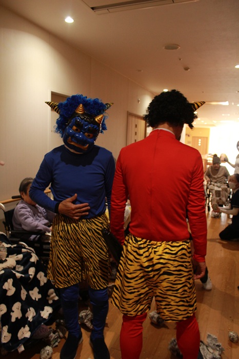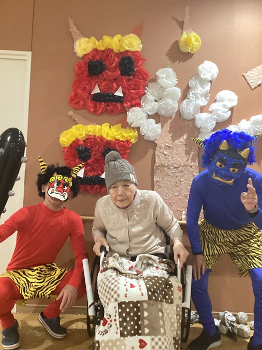 節分の行事は日本に深く根付いた風習で、入居者の皆さまも親しみ深く楽しそうに豆をまいている様子が印象的でした。