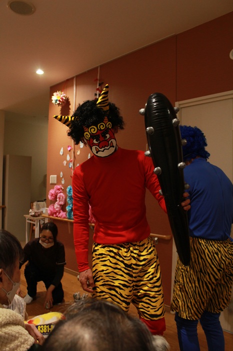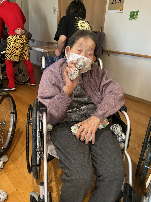 途中鬼たちも応戦してくるなどかなり長時間にわたる激しい攻防となりましたが、入居者の皆さまによる四方八方からの総攻撃に無尽蔵の体力を誇る鬼たちもさすがに根負け。