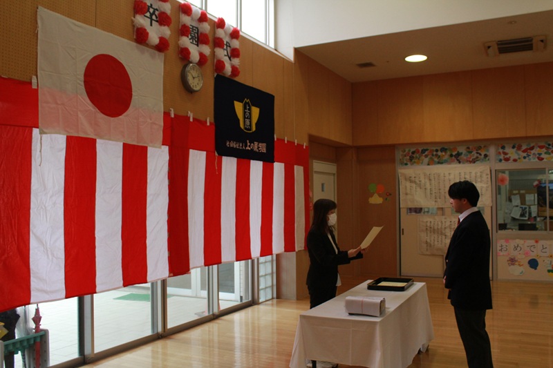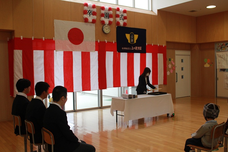 園長の話を聞いた後に卒園生4名が思い思いに園長から卒園証書を受け取りました。